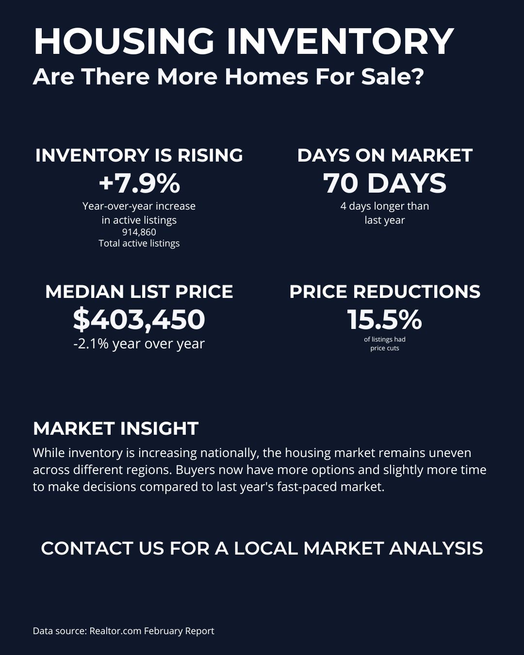 Buyers have more choice than they did a year ago, but sellers still need sharp pricing. More inventory plus longer marketing times means realistic pricing and strong presentation matter more than ever.
