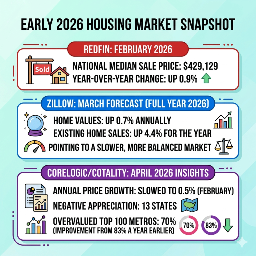 Redfin said the national median sale price in February 2026 was $429,129, up 0.9% year over year. Zillow’s March forecast projected home values to end 2026 up just 0.7% annually, and existing home sales up 4.4% for the year, pointing to a slower, more balanced market rather than a sharp rebound. (Redfin)